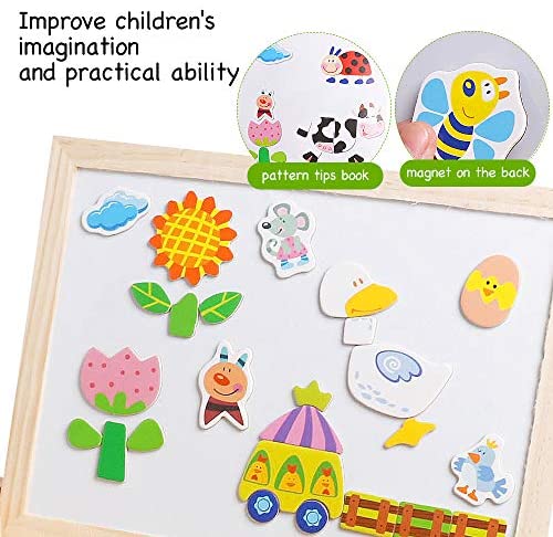 Magnetic puzzle: Size: 11.8*9.4*1.5 in, 70 magnetic puzzle pieces, can be combined with animals, plants and other natural objects. This game also comes with a model book where you can look for new inspiration. Multifunctional blackboard: A black page with chalk, a white page with Velleda felt-tip pens, on which you can write and draw freely; both sides are magnetic and puzzle pieces can be glued on both. Educational game: This game encourages childrens creativity and imagination and hand coordination. Also deepens childrens understanding of animals, plants, colors and shapes. Safe and practical: Made of high quality wood, thoroughly polished without smearing, non-toxic. If you no longer want to play with this game, you can simply put all the pieces in the box and cover them with the board.You will receive a wooden box, a double-sided board, 100 colored magnetic puzzle pieces, 3 chalks (random colors), 3 felt-tip pens (red, black, blue), a sponge for wiping, a model booklet. ULTIMATE GIFT IDEA: No one falls out of love with the puzzle. Perfect gift, free shipping. Skrtuan value our customers and want you to enjoy a pleasant shopping experience! If you have any questions, please contact us. We give you 100% satisfaction solution. Add to cart now !!