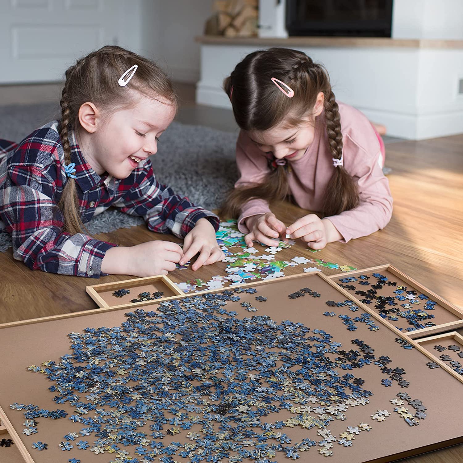 Extra Large – Large Size jigsaw puzzle table work space measures 35 x 27 and fits most 1500 pieces puzzles (puzzle sizes may vary), portable puzzle table for teens and adults. Ample Storage Space – This puzzle plateau has six wooden-reinforced sliding drawers to sort and store your puzzle pieces. Organize by shapes or colors in these convenient built-in puzzle trays! Smooth Work Surface – Made of durable composite wood and solid hardwood, our puzzle table is built to last. The smooth work surface provids the best sorting, assembly, and storage solution for puzzlers. Easy & Convenient – Pieces glide effortlessly into place and stay firmly planted due to our two-sided integrated edging. The wooden fence can prevent puzzle falling out, The open side makes it easier to keep your puzzle intact after finishing. Great Gift for Puzzlers – This thoughtful puzzle accessory is a wonderful gift for all puzzlers, Christmas, birthdays, anniversaries, Mothers Day, or as an anytime present!