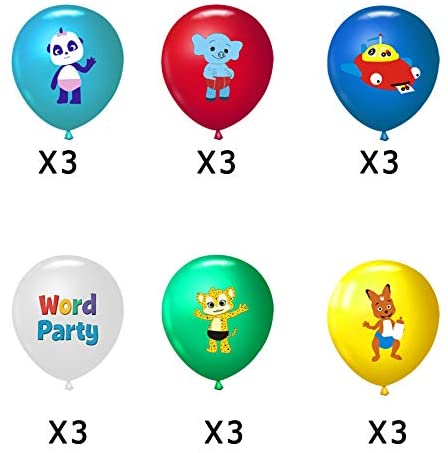 INCLUDES 1 x Happy Birthday Banner; 6 x Word Party hanging swirls; 10x 9 inch plates; 10x 7 inch plates; 10 x spoon; 10 x knife; 10 x fork; 1 x tablecover; 20 x napkin; 18 x balloons