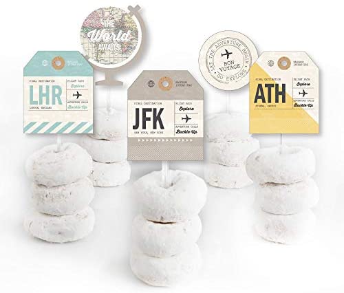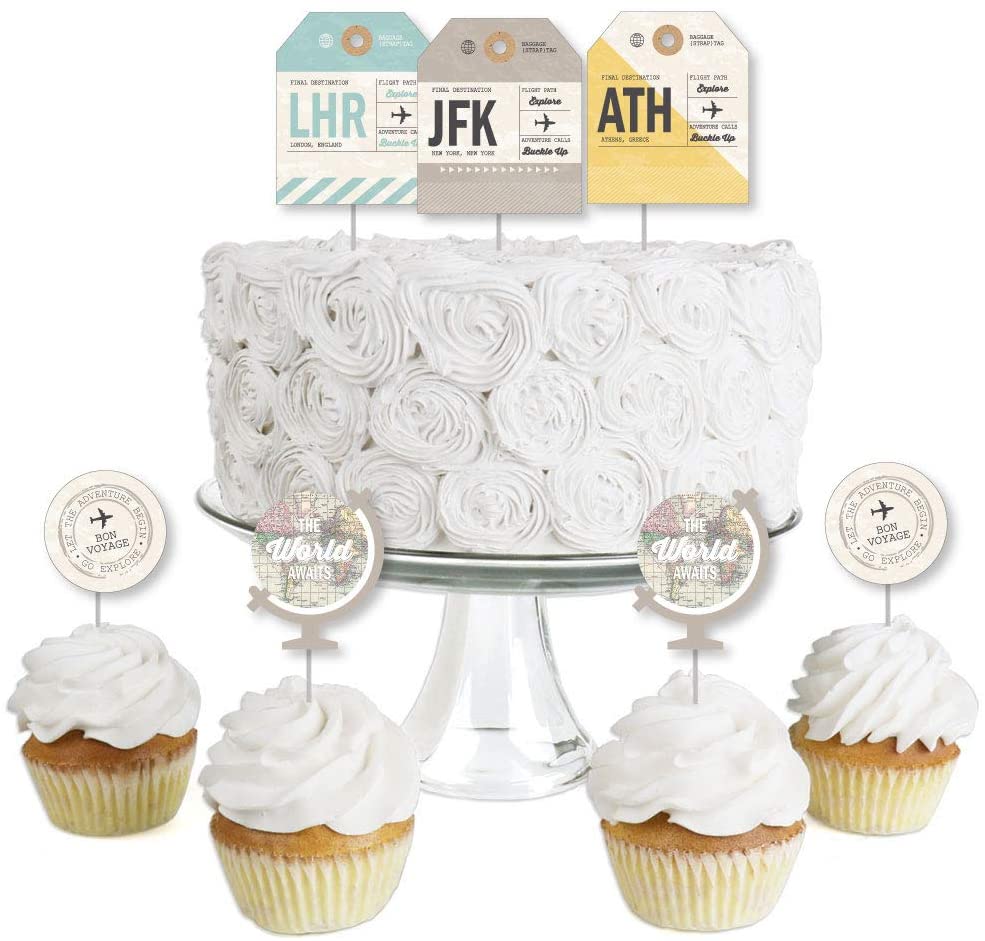World Awaits Dessert Cupcake Toppers INCLUDES 24 clear treat picks, 24 shaped paper cut outs and stickers for easy assembly. DIY World Awaits cupcake supplies are perfect for a bridal shower, graduation, retirement and birthday party. Plastic clear treat pick SIZE 3.5 inches tall with the completed height of the World Awaits Dessert Cupcake Topper depending on where the plastic pick is attached to the shaped paper cut out. Cupcake toppers are perfect for standard cupcakes and can also be added to appetizers and individual servings of other sweet treats such as brownies or donuts, and even used to create small fruit kabobs. EASY PARTY DECORATIONS: World Awaits bridal shower, graduation, retirement and birthday party picks make it easy to style a Travel theme party. Create impressive cupcake towers with decorated treats placed on a tiered stand at the candy buffet table, style adorable tables with individual cupcakes at each place setting, or make creative centerpieces using decorated treats and a coordinating treat stand. PREMIUM PARTY SUPPLIES: Clear treat picks are made of food-grade plastic and packaged in a food-safe environment. The World Awaits paper cut out toppers are professionally printed on heavy-duty cardstock paper with themed art on one side and a coordinating pattern on the back. Cut outs will quickly attach to the clear dessert pick and then easily insert into your party appetizers or desserts. EASY ASSEMBLY INSTRUCTIONS INCLUDED: Clear treat picks and World Awaits shaped cutouts will ship with easy assembly instructions to create unique dessert cupcake toppers.