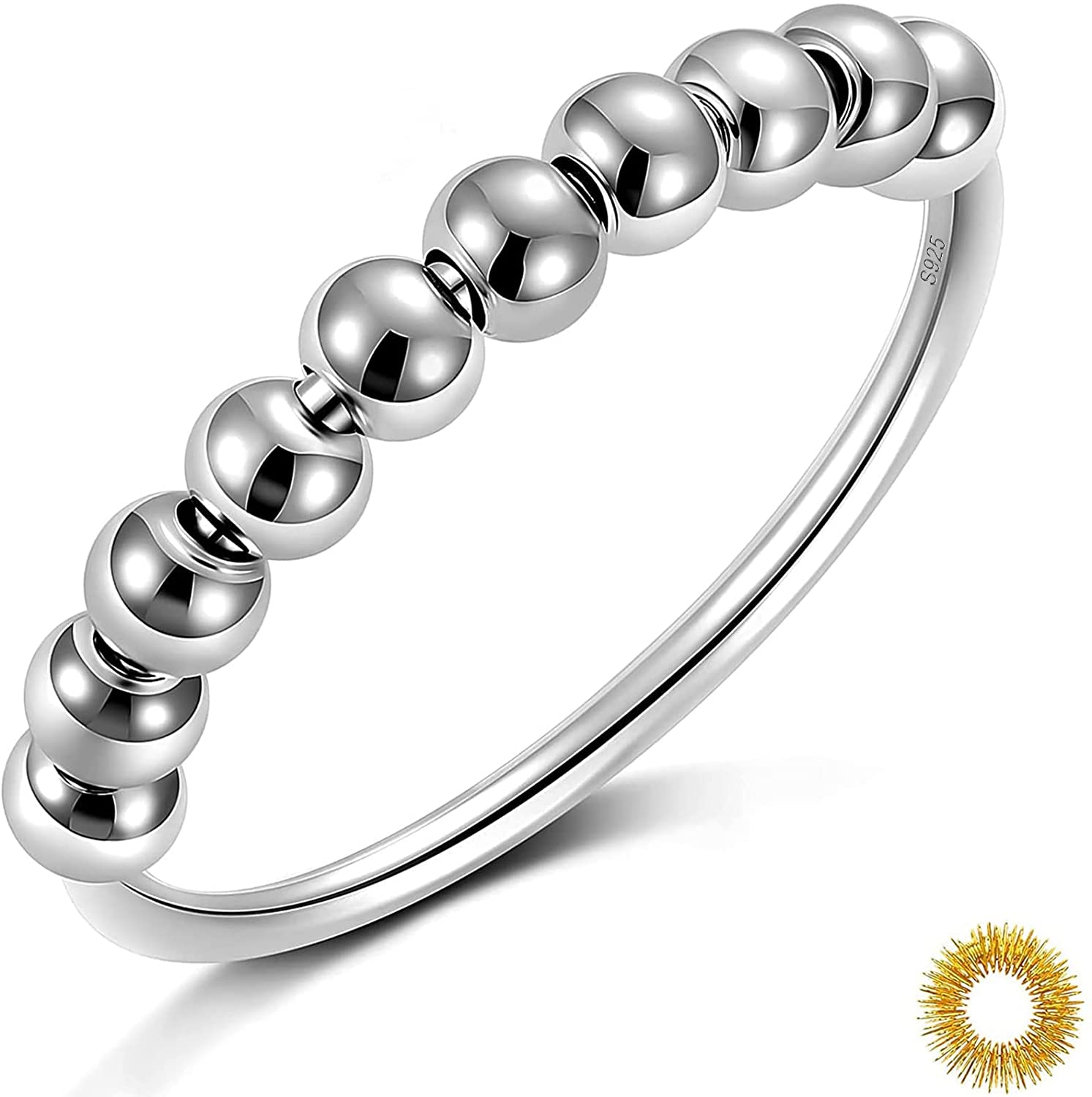STRESS RELIEF RING CONCEPT: Unlike fidget spinners,which are somewhat noisy and you have to carry them with you.When you feel depressed or anxious,twisting the 10 round beads on the spinner fidget rings can help you relieve stress and restore mood and eliminate bad habits in a stylish way :),especially helpful for those with attention disorders,OCD,special needs,or high anxiety levels. SIZE & MATERIAL: Beads size:3mm,band gauge:1.2mm,ring size:4,5,6,7,8,9,10,11,12,13,14,15.12 sizes available so you can easily choose your fit.Different from cheap alloy materials,the fidget spinner ring made from S925 sterling silver with elaborately polished and have a smooth and delicate touch, which will not cause scratch or any damage to the wearer. MULTI-FUNCTION: The design of the anti anxiety ring is ingenious. It contains 10 movable beads.It can be adjusted and moved according to your mood.Its perfect as a temporary tool to carry your pressure.In addition,the appearance design of the ring is also wonderful.The ring can be used as a beautiful decoration when you dont use it. FOR ALL OCCASIONS: When you feel nervous in different occasions like party,dinner,travel,etc.,you can use the ring to help you divert your attention from the sad mood,so as to regain a good mood. A GREAT GIFT IDEA: Pack with Finger Acupressure Massage Rings,which can help people anti-anxiety everywhere while being gorgeous,which is a considerable gift for your lovers,friends,mother,daughter,and sisters.On occasions such as Birthday parties,Holidays,Anniversaries,Weddings,Christmas,etc.