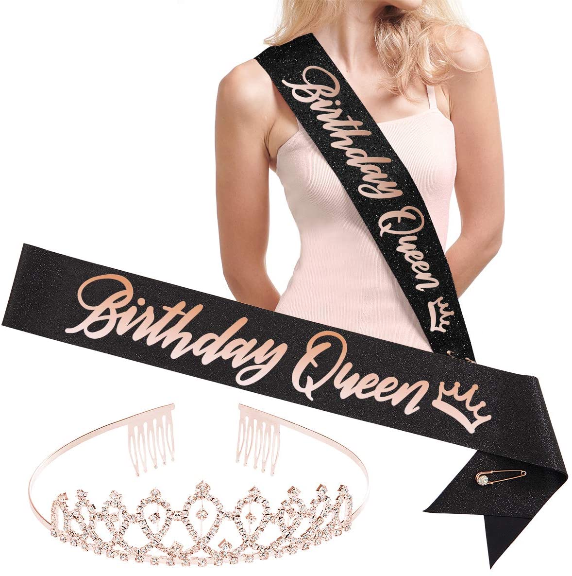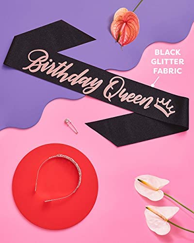xo, Fetti Birthday Queen Sash + Tiara – Black Glitter + Rose Gold Foil | Birthday Party Decorations – 16th, 21st, 30th, 40th, 50th, Girl