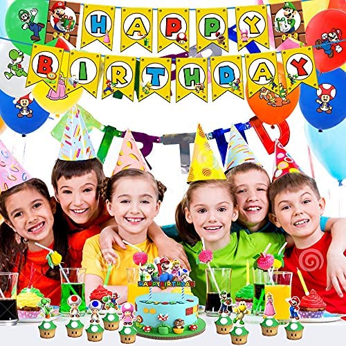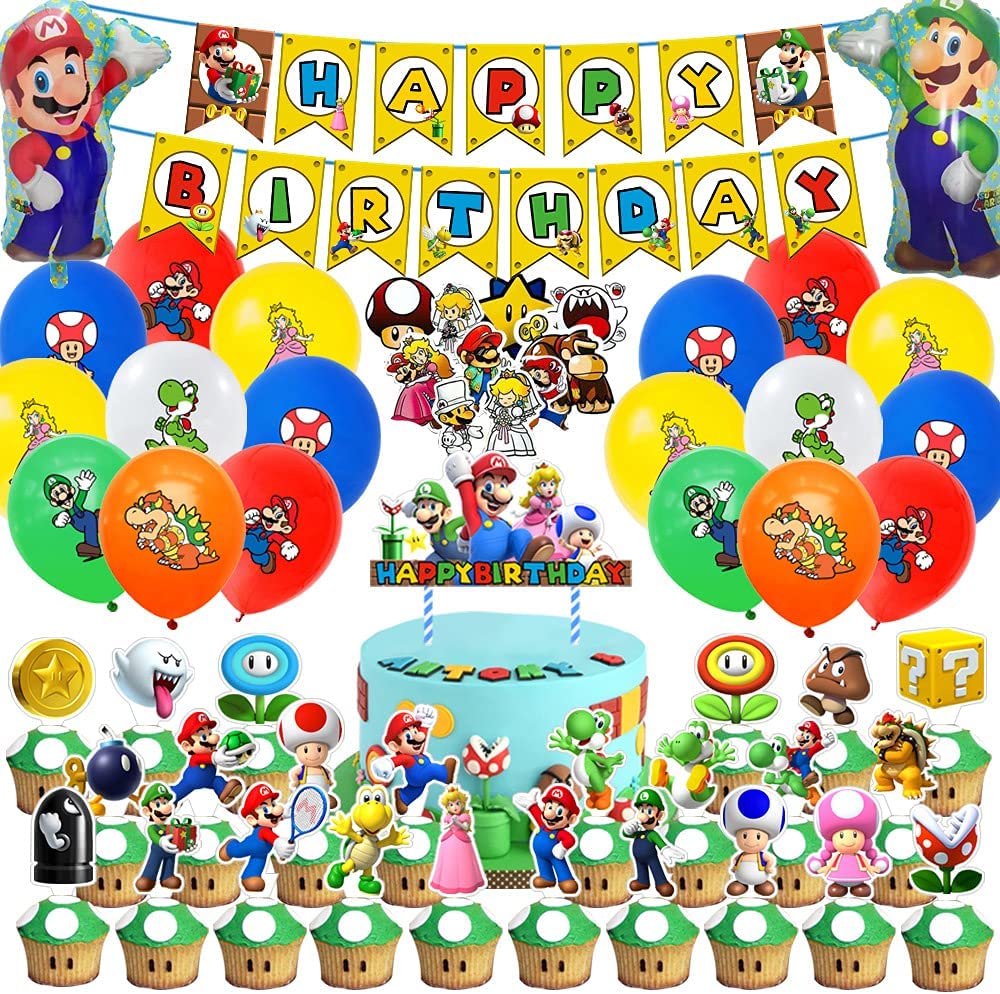 Yakemmer Super Mario Birthday Party Supplies Included Banners, Cake Topper, Cupcake Toppers, Balloons Stickers for Party Supplies