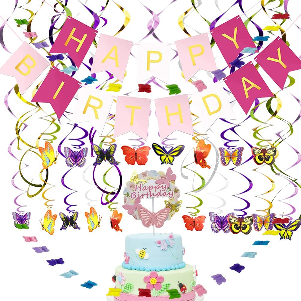 YAR Butterfly Birthday Decorations Butterfly Party Supplies for Girls include Butterfly Hanging Swirls Paper Butterfly Garlands Butterfly Cake Toppers Happy Birthday Banner Backdrop