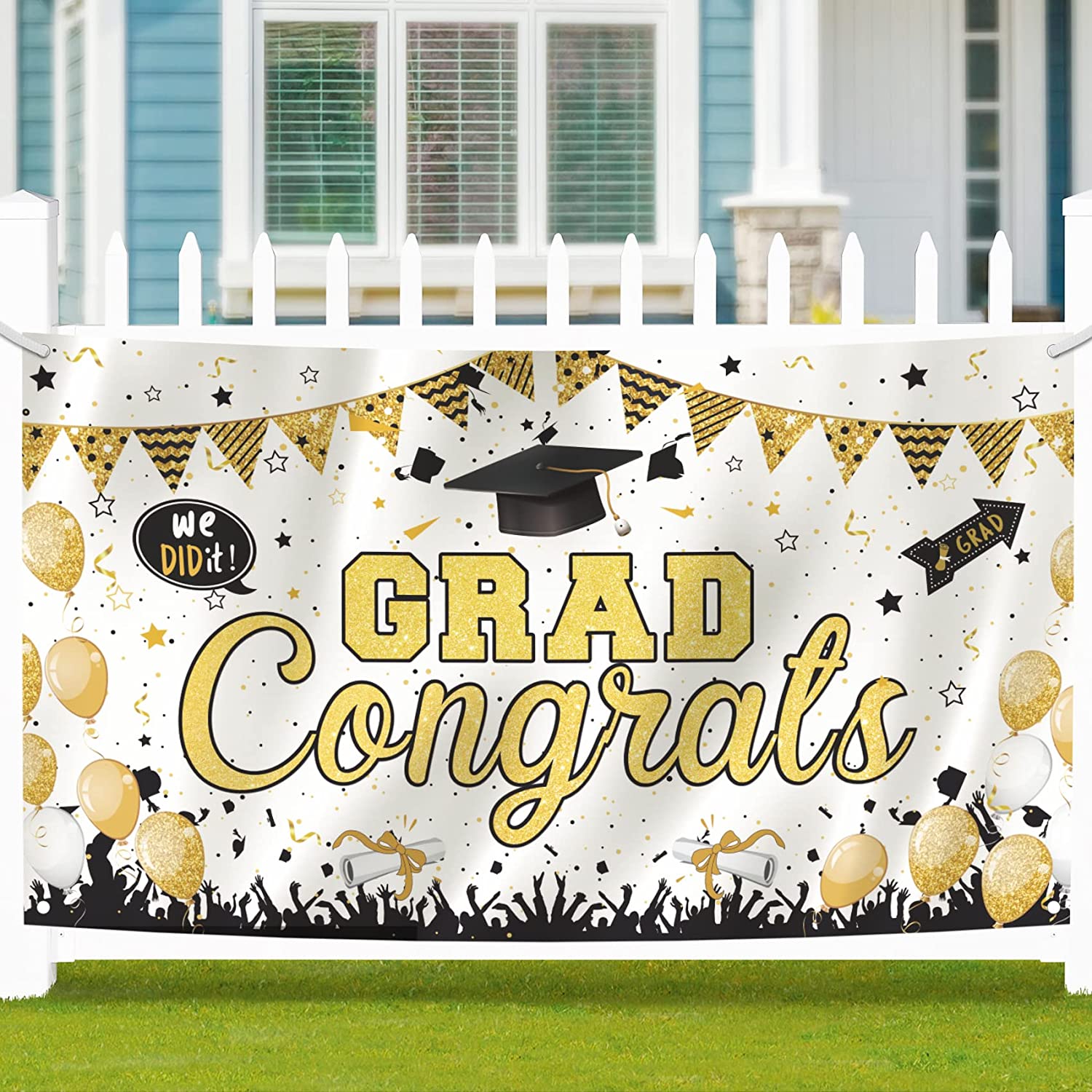 Large Banner SizeThe graduation banner backdrop size is 74.8×43.3 INCH.Add a graduate banner backdrop to your party with a large graduation banner backdrop with Grad and Congratulate. This must be eye-catching at a graduation party. Highly Quality Materialour graduation banner backdrop is made of polyester fabric, which is durable, washable, reusable and lightweight that is easy to carry to the party venue. Easy to UseThe package is with rope, just attach through 4 holes at the corners and hang it on the wall, photo booth or fence. Lets celebrate this exciting graduation season! Widely ApplicationThis graduation banner backdrop will be a party decorations for celebrating the graduation season. It can be widely used in different parties at high school, college, garden, home, photograph studio, etc. 1 Year Warranty If you have any quality problems with our graduation banner backdrop, please contact us,we will reply you within 24 hr!