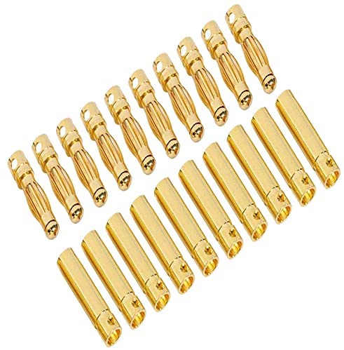 Description: Item name: Gold-plated 4mm 4.0mm male female banana plug bullet connector adapter. Metal material : Gold-plated copper. Electric current( Max.): 55A . Recommend wire gauge: 12AWG . Low resistance, and gives the best electric flow. Hook up brushless motor to electronic speed control. Connect ESC Battery with Electronic equipment such as RC helicopter. Connect Brushless motor with electronic speed control . Used in RC battery ESC motos, or other RC DIY purposes. Ideal for all types of R/C( Cars, Boats, Planes, Helicopters) Package Included: 20pcs * Gold-plated 4mm 4.0mm banana plug bullet male connector. 20pcs * Gold-plated 4mm 4.0mm banana plug bullet female connector.