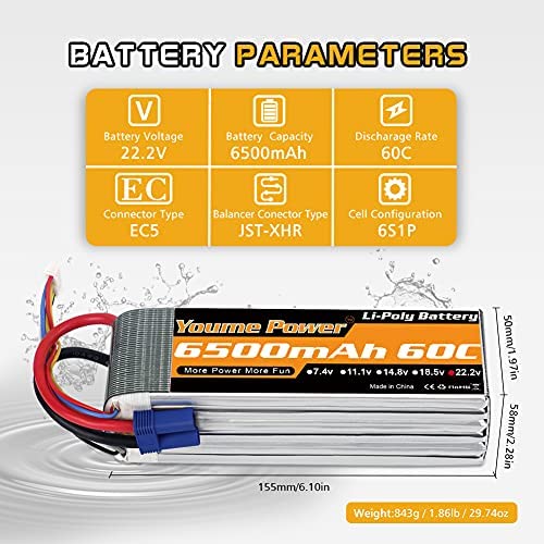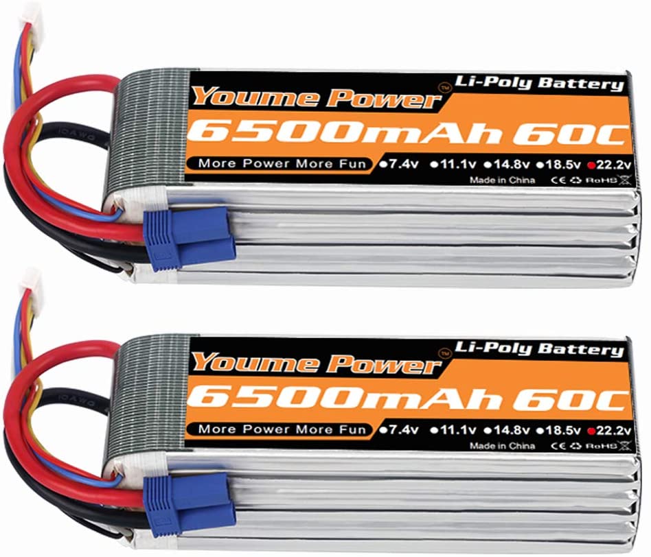 Youme 6S Lipo Battery EC5, 2Packs 22.2V RC LiPo Battery 6500mAh 60C with EC5 Plug for RC DJI E-Flite Airplane Quadcopter Helicopter Align 7.2 700L Yak 54 T-REX