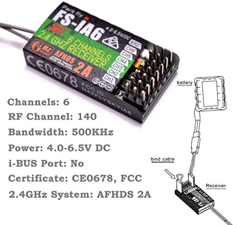 Specifications: Channels: 6 Model Type: Fixed-Wing/Glider/Helicopter RF Range: 2.4055-2.475GHz RF Channel: 140 RF Receiver Sensitivity: -105dBm Bandwidth: 500KHz 2.4GHz System: AFHDS 2A Modulation Type: GFSK Power: 4.0-6.5V DC Antenna Length: 26mm (Dual Antenna) Weight: 7g Size: 40.4*21.1*7.35mm i-BUS Port: No Data Acquisition Port: No Color: Black Certificate: CE0678, FCC Package includes: 1x FlySky FS-iA6 Receiver