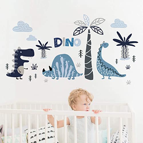 Yovkky Boys Blue Gray Dinosaur Wall Decals Stickers, Dino Animal Peel and Stick Nursery Coconut Palm Tree Clouds Decor, Home Baby Toddler Room Decoration Kids Bedroom Playroom Art Party Supply Gifts