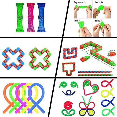 Fidget Pack-The fidgets toys set comes: 1 rainbow unicorn popping bubble,1 dinosaur rainbow popper bubble,1 Ice rainbow popping toys,4 pop tube, 5 stretchy strings,3 dinosaur stretchy strings,1 mini fidget spinner,3 marble and mesh fidget,1 infinity fidget cube,1 Original Flippy Chain,2 Wacky Tracks,2 Squeeze Edamame,4 sensory finger ring,1 stress ball,1 Squeezer Grip Ring Stress Relief and Anti-Anxiety Tools Bundles-these fidgets collection can bring a lot of fun, and same time make your mind calm down, relax, get rid of stress and anxiety, then happier, easy to more concentrate on what you are doing. By flippy, stretching, push, bubble wrapping, press, squeeze, make your hand busy Gift and Present-good selection for teachers for classroom rewards, birthday, pinata, Christmas Stocking Special Toys for Autism Kids-there are also nice choice for the kids who are ADHD, ADD, OCD, make them busy also killing boredom. It is great for girls and boys Easy to Carry-hand held size fidgets, you can take this pack of fidgets anywhere, anytime such as car, church, bus station. Toys for All Ages-no ages limitation, all ages can play with, you can share with your families, co-workers, roommates