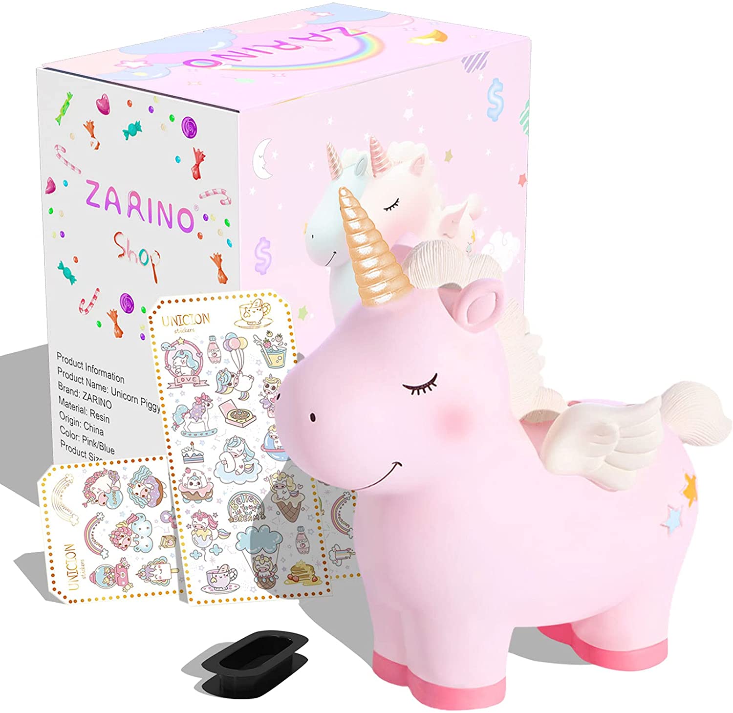 EXTRA LARGE & Fits All Coins- Large size (L x W x H) 9.4 x 4.7 x 9.8 inches upgraded to hold more coins for pennies, nickels, dimes, quarters, half-dollars, and one-dollar coins. Removable Unicorn Piggy Bank- With a removable rubber stopper at the bottom of the piggy bank, you dont need to drop and break the jar to get your savings. When not needed, it can be used as a decoration and a childhood souvenir. Durable Resin Piggy Bank- The product is made of synthetic resin, which is not easy to wear, colorful, malleable, easy to clean, and odorless. You do not have to worry that it will break and cause harm to children. Cute Unicorn- Beautiful and fantastic unicorn design, exquisite workmanship, and vivid expressions, with two color options of baby blue and macaron pink. Stickers allow you and your child DIY, play the imagination and aesthetics of children to create a unique unicorn money box Perfect Gift & Good Habit- The unicorn piggy bank for boys and girls is a meaningful gift, perfect for your child to store coins and develop a saving habit. Kids will learn to save money as they fill this special piggy bank!