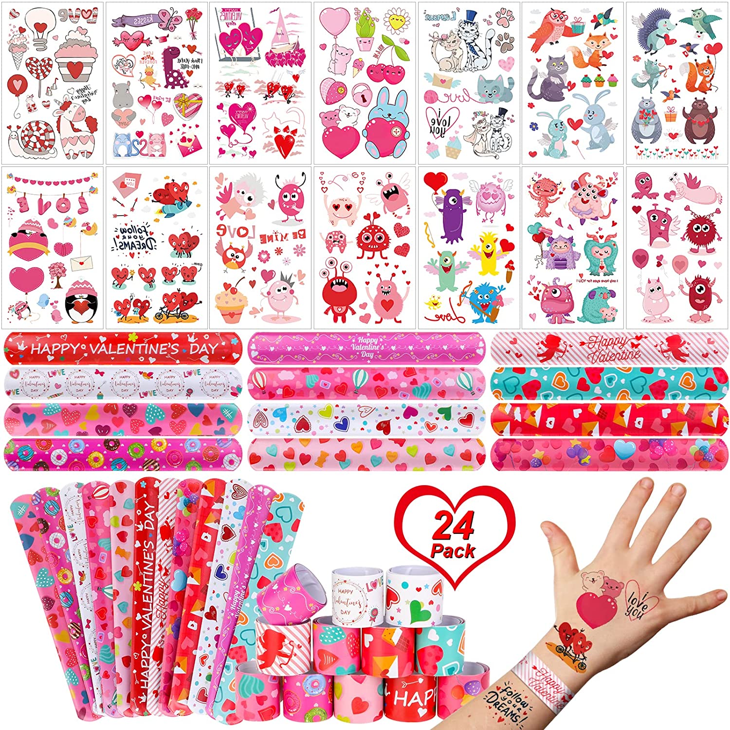 Zayvor 12 Valentines Slap Bracelets Wristbands, 12 Kids Temporary Tattoos Sheet, Heart Donut Monster Friendship,Valentineu2019s Day Party Favors Supplies, Valentines Gift Classroom Prizes Exchanging