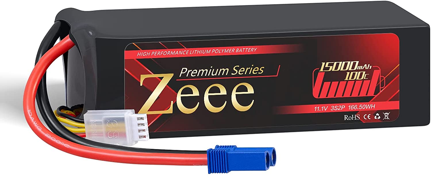 Zeee Premium Series Lipos Specification- Battery Voltage: 11.1V; Configuration: 3S2P; Capacity: 15000mAh; Discharge: 100C; Connector: EC5 Plug.