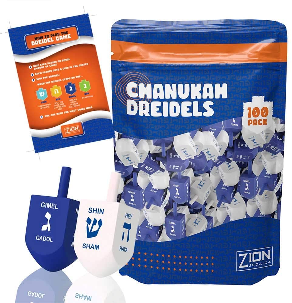 Zion Judaica Hanukkah Dreidels Blue & White Natural Wood with English Translation & Transliteration (100 Pack)