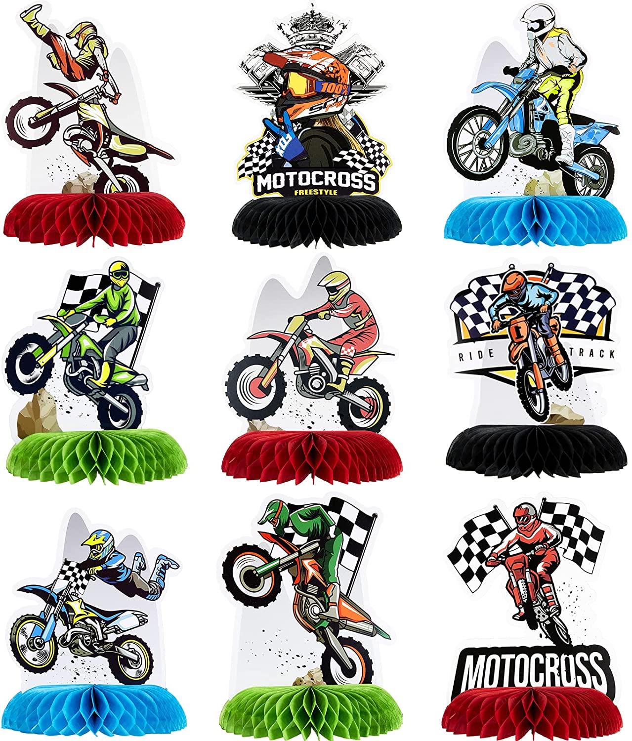 Zonon 9 Piece Dirt Bike Motorcycle Honeycomb Centerpiece Table Topper Racing Motocross Theme Birthday Party Supplies Table Desktop Decoration for Kids Birthday Motorcycle Party Photo Booth Props