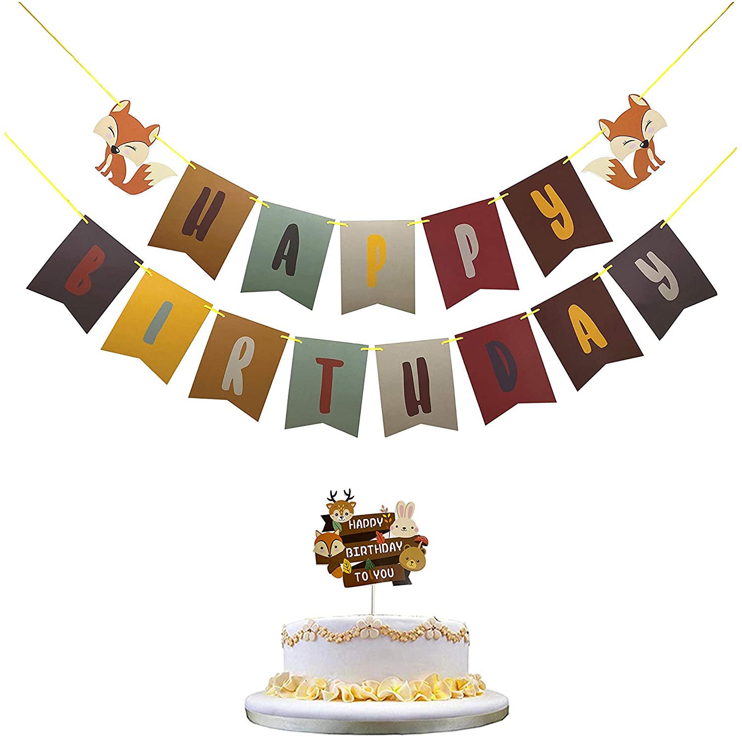 Zotemo Animal Happy Birthday Banner and Cake Topper with Fox Signs, Hanging Colorful Garland for Animal Themed Kids Birthday Party Decorations